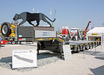 Extrem klar präsentiert sich der Messestand von Doll. Nur zwei Tieflader haben die Oppenauer ausgestellt: Neben einem bekannten Vario steht der neue Panther mit 315 Millimeter Gesamthub. Da alle „Tatzen“ gelenkt sind, kann der Siebenachser auch eng ansteigende Spitzkehren samtig wie ein Panther umrunden. Eher ein Nebenaspekt war die verbesserte Oberflächenbeschichtung, der man laut dem Leiter des Geschäftsbereiches Schwertransport, Patrick Spitznagel, bislang zu wenig Bedeutung beimaß. „Da die Kunden in letzter Zeit verstärkt das Thema Korrosion ansprachen, werden wir den Zinkstaubgrund künftig serienmäßig mit aufbringen.“ Optional hat man außerdem die Wahl zwischen Spritzverzinken oder einer Pulverbeschichtung. Korrosionsresistente Tieflader liefert Doll schon seit Langem an die Bundeswehr, wo die Fahrzeuge von vornherein mit zwanzig Jahren Laufzeit plus x kalkuliert werden.